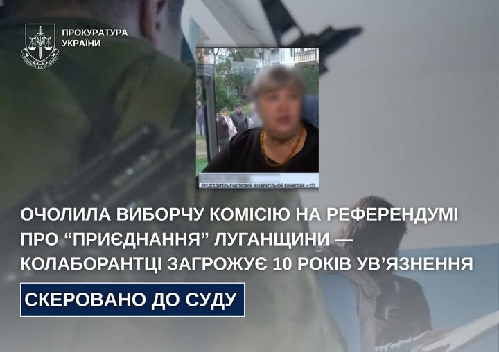 Прокурори Чернівецької обласної прокуратури направили до суду обвинувальний акт стосовно 65-річної мешканки Луганщини, яка під час окупації добровільно очолила виборчу комісію на псевдореферендумі про «приєднання» регіону до росії.