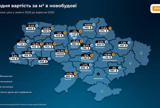 Альона Кириченко У жовтні попит на новобудови серед українців знизився у значній частині країни, в деяких регіонах зростає вартість квадратного метра. Про це йдеться в дослідженніDIM.RIA. Зазначається, що найбільший приріст ціни на первинне житло у Вінницькій (+4,7%) та Житомирській (+4%) областях. Київ залишається найдорожчим містом: середня вартість квадратного метра у столиці — $1 427/м². Найнижчі […]