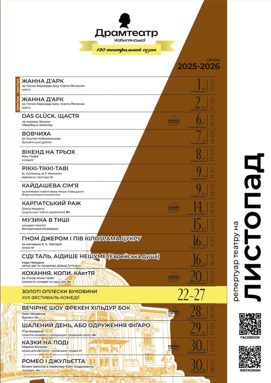 Чернівецький обласний музично-драматичний театр імені Ольги Кобилянської оприлюднив афішу останнього осіннього місяця.