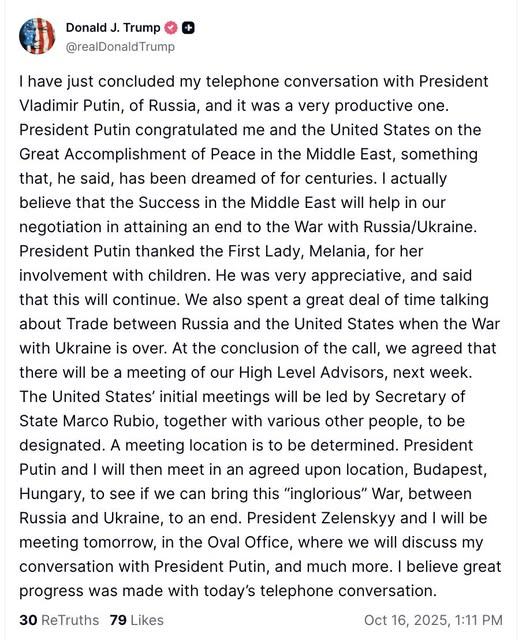 “Президент Путін привітав мене та США з Великим досягненням миру на Близькому Сході, про що, за його словами, мріяли століттями. Я щиро вірю, що успіх на Близькому Сході допоможе нам у переговорах щодо припинення війни з Росією/Україною. Президент Путін подякував Першій леді Меланії за її участь у питанні дітей. Він був дуже вдячний і сказав, що це продовжиться. Ми також провели багато часу за обговоренням торгівлі між Росією та США після закінчення війни з Україною.