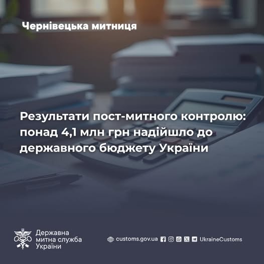 Упродовж 9 місяців 2025 року підрозділами Чернівецької митниці активно застосовувалися інструменти пост-митного контролю, що дозволило своєчасно виявляти порушення митного законодавства, усувати їх, як і у добровільному порядку, так і за виставленими податковими повідомленнями-рішеннями та забезпечити додаткові надходження до Держбюджету України.