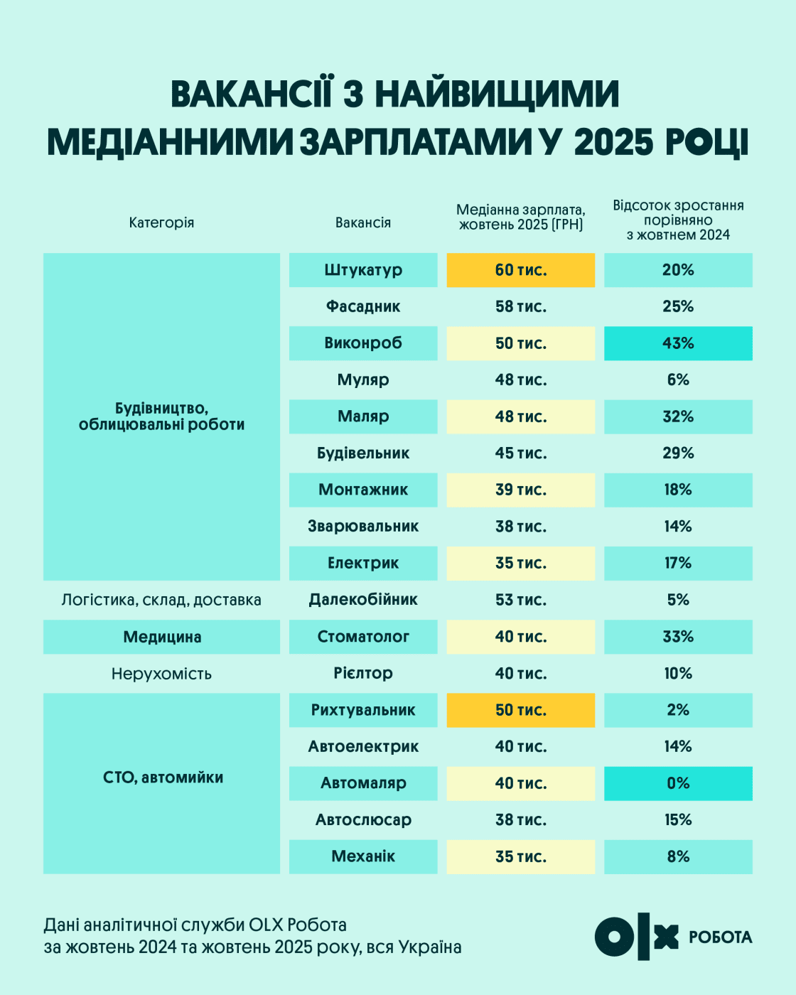 штукатур 60 тис. грн (на 20% вище, ніж у жовтні 2024);