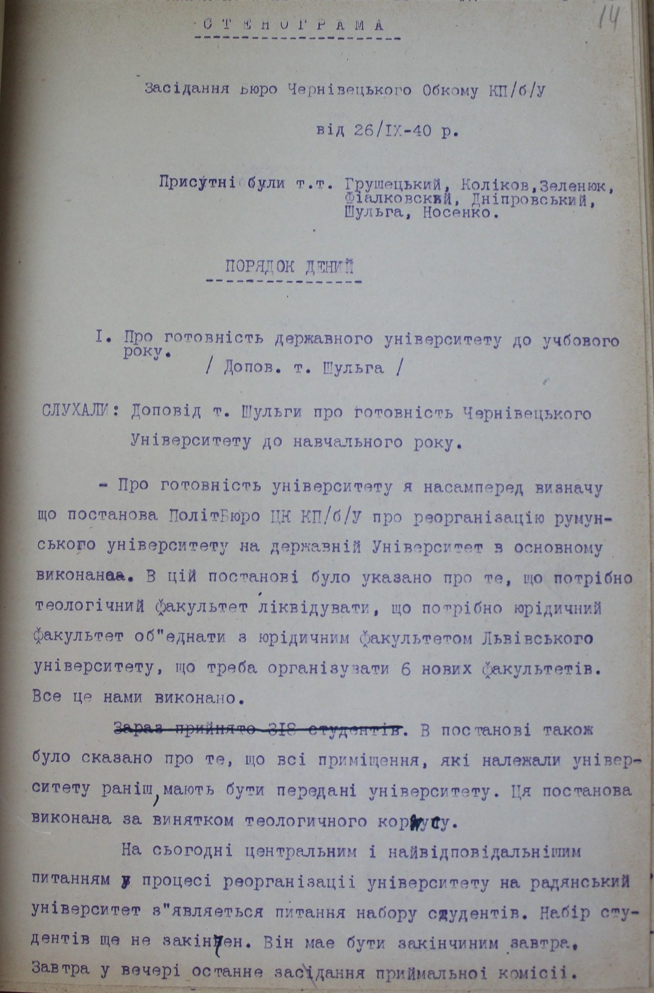 Відповідно до ухваленого партією рішення, в Чернівецькому університеті передбачалося ліквідувати теологічний факультет, а юридичний факультет об’єднати з юридичним факультетом Львівського університету. При тому, що із 1553 студентів, які навчалися в університеті у 1939/1940 роках, 72% (1133) навчались на теологічному та юридичному факультетах.