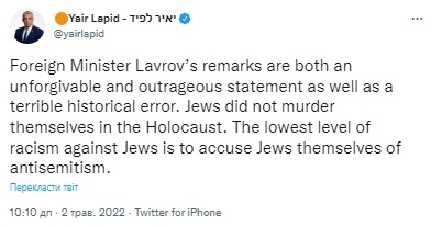 “Висловлювання Лаврова – це обурлива та непробачна заява, а також жахлива історична помилка. Євреї не вбивали себе під час Голокосту. Найнижчий рівень расизму щодо євреїв – це звинувачувати самих євреїв в антисемітизмі”, – написав міністр закордонних справ Ізраїлю .