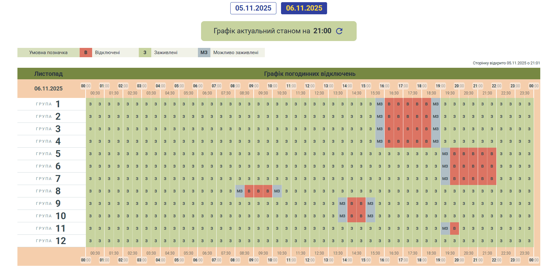Орієнтовний графік заживлення для груп споживачів • 06.11.2025
