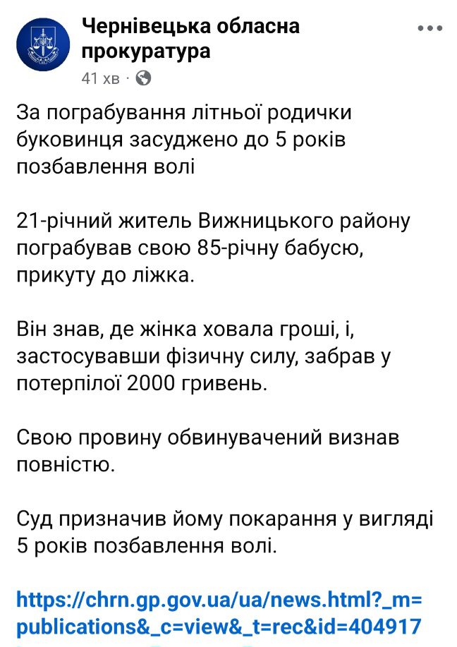21-річний буковинець пограбував прикуту до ліжка бабусю 14.11.202514.11.2025Leave a Comment on 21-річний буковинець пограбував прикуту до ліжка бабусю Джерело: https://www.facebook.com/share/p/1CSZhJtEcf/ peredplata